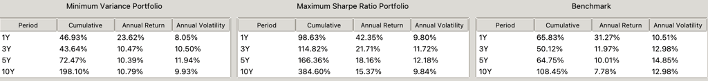Que ce soit sur 1 an, 3 ans, 5 ans ou 10 ans, la conclusion reste la même. Les portefeuilles construits scientifiquement surperforment le benchmark de manière consistente, offrant de meilleurs rendements cumulés, annuels, et souvent avec une volatilité plus faible.