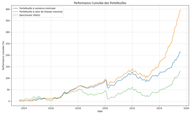 Le constat est sans appel. Alors que l'investissement dans le benchmark (courbe verte) a modestement progressé, nos deux portefeuilles optimisés ont littéralement décollé, en particulier le portefeuille Max Sharpe Ratio, le "Moteur Optimal" (courbe orange).