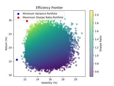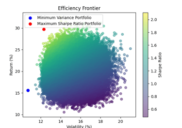 La frontière efficiente : Le graphique ci-dessous montre des milliers de portefeuilles aléatoires (le nuage de points). Nos deux champions (les points bleu et rouge) se situent sur la "frontière", le bord extérieur, là où se trouvent les combinaisons optimales. Tout le reste est sous-optimal.