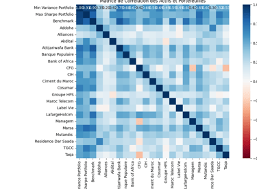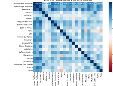 La matrice de corrélation (L'Ingrédient Secret) : Un portefeuille performant ne combine pas que des actions qui montent. Il combine des actions qui ne montent et ne baissent pas toutes en même temps. La matrice ci-dessous le montre : les carrés bleu foncé indiquent une forte corrélation (ils bougent ensemble), tandis que les tons plus clairs ou orangés indiquent une faible corrélation. L'art de l'architecte est de mélanger ces couleurs pour construire une structure solide.