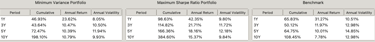 Un graphique vaut mille mots. Voici l'évolution de la performance cumulée des deux portefeuilles par rapport au benchmark sur 12 ans.