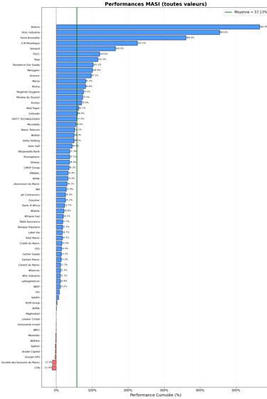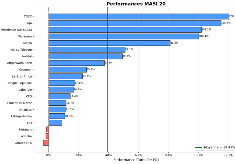 Le graphique du MASI 20 raconte une histoire bien différente : celle d'une croissance plus homogène et bien moins chaotique. Les performances sont plus resserrées, les extrêmes sont gommés. On y retrouve des performances remarquables (TGCC à +120 %, Taqa à +115 %), mais sans les anomalies statistiques qui caractérisent le marché global.