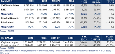 Une Structure Financière Solide : L'endettement net consolidé a drastiquement chuté, passant de 1,4 milliard de dirhams en 2023 à 832 millions de dirhams en 2024, soit une baisse de 40,8%. L'entreprise se désendette (sur le moyen/long terme) tout en augmentant sa rentabilité.