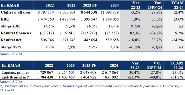 Une croissance impressionnante : Entre 2022 et 2024, le chiffre d'affaires consolidé de SGTM a connu un Taux de Croissance Annuel Moyen (TCAM) de 12,4%, passant de 8,5 à 11,1 milliards de dirhams.