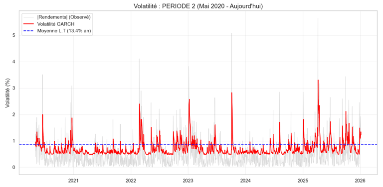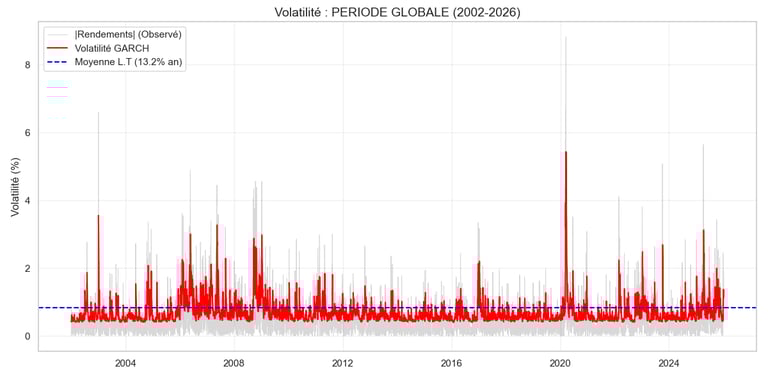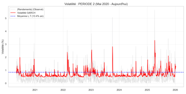 Volatilité Long Terme (13.18%) : C'est la partie "rationnelle". Une fois la poussière retombée, le marché tend toujours à revenir vers ce niveau de risque modéré.