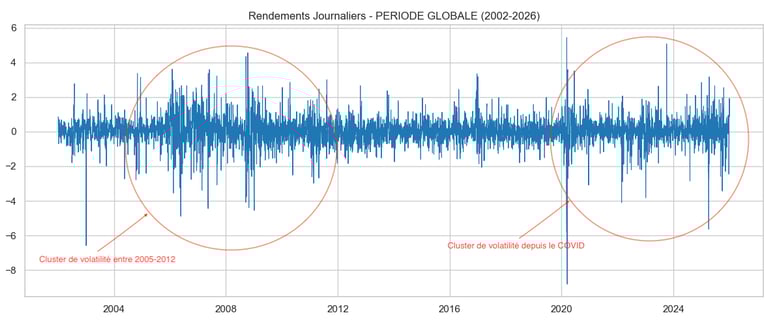 Dans la finance classique (celle qu'on apprend trop vite), on suppose souvent que le risque (la volatilité) est constant. C'est faux. Le risque n'est pas une ligne droite, c'est un électrocardiogramme. Il y a des périodes de calme plat et des tempêtes soudaines. C'est ce qu'on appelle les "clusters de volatilité".